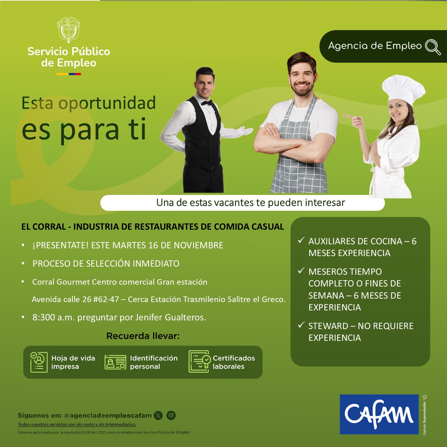 ✔*Beneficios:* posibilidad de crecimientos, Consumo diario en cadena el Corral del 50% durante la jornada laboral, Convenios con gimnasios y diferentes entidades, Seguro de vida, Día de cumpleaños y 2 días de la familia (1 por semestre)